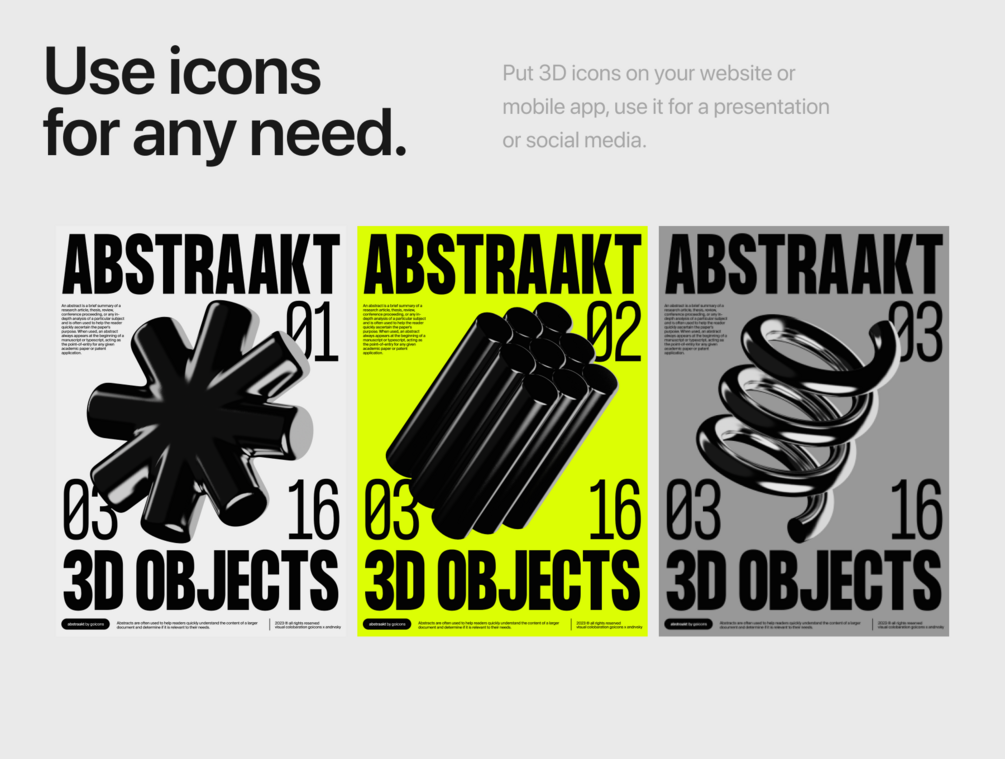 Abstraakt is a pack of custom 3D objects suitable for any kind of project. Create stunning, unique projects with these hand crafted abstract objects, easily editable in Figma, and fully customizable in Cinema 4D.